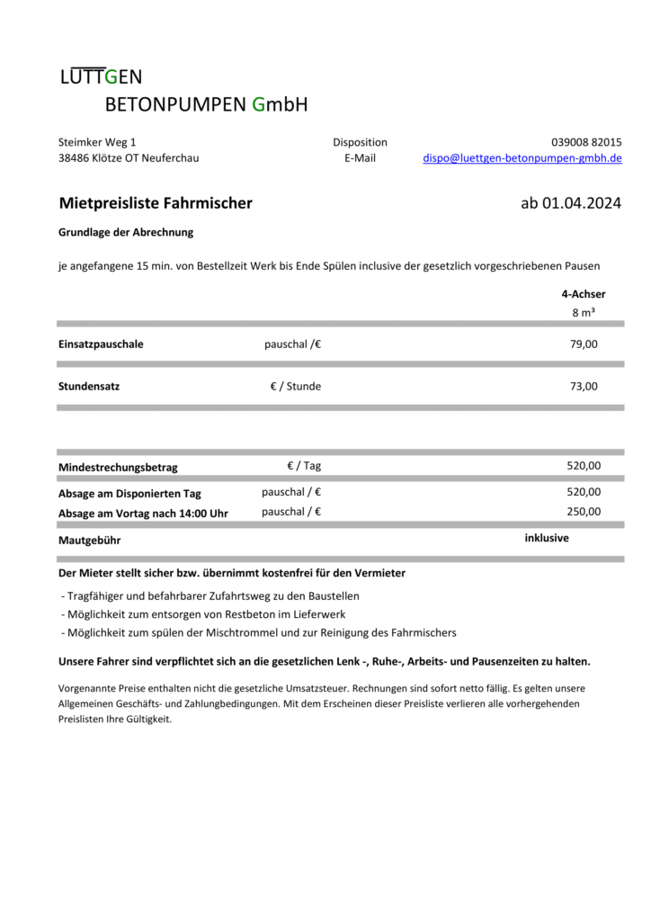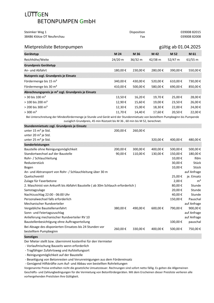 Wir decken mit unseren Betonpumpen alle gängigen Reichweiten ab. Von der kleinen Zweiachser Betonpumpe mit einer Reichweite von 20m bis hin zur M61 mit einer Reichweite/Höhe von 55/61m sind wir gut aufgestellt. Natürlich können wir alle Betonpumpen mit Schlauchleitung verlängern.